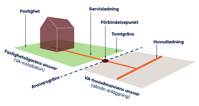 Du som husägare ansvarar själv för alla ledningar fram till den så kallade förbindelsepunkten. Förbindelsepunkten är vanligtvis 0,5 meter utanför fastighetsgränsen. Det innebär att du står för åtgärder inom din fastighetsgräns samt fram till förbindelsepunkten. Mälarenergi ansvarar för ledningar och anläggningar ute i gatan och fram till förbindelsepunkten.